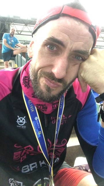 Salgo y trato de mentalizarme que sólo quedan 5 km para llegar a la meta . Ahí empieza esa pelea entre cabeza y cuerpo , donde la cabeza quiere apretar y llegar cuanto antes a meta y las piernas dicen que no, que no pueden más. Además el estómago no estaba del todo fino . Por tu cabeza en ese momento te pasan muchas cosas , nunca abandonar, pero sí que piensas en ponerte a andar para sufrir menos , o empiezas a preguntarte qué haces ahí solo , incluso el por qué haces tantas locuras , o si te merece la pena esos dolores . Son momentos de bajón, que con una llamada , mirando una foto o calmándote les encuentras respuesta fácilmente . TODO MERECE LA PENA , es fácil meterte en un bucle negativo en ese momentos, pero sinceramente, en el km 38 de un maratón , en Donosti, haciendo lo que más me gusta , se puede estar De bajón?? Tomi te das cuenta la suerte que tienes de poder estar aquí disfrutando de un maratón?? Y entonces todo lo que parece malo se convierte en bueno, y donde había sufrimiento ahora hay energía , y donde había bajón ahora hay subidón .