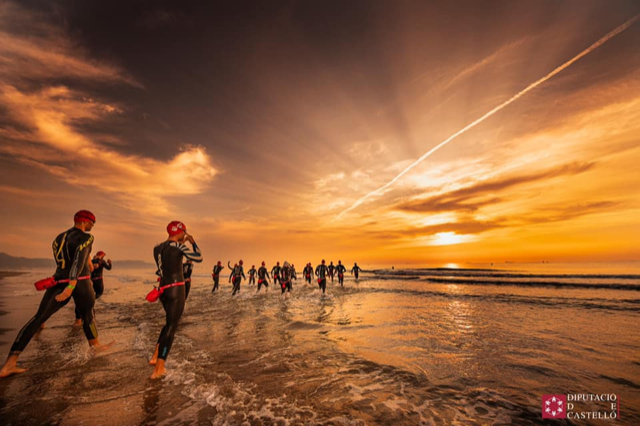En el desayuno todos tenemos esa cara de sueño y susto que va acompañada de esa sonrisa que oculta cierto grado de nerviosismo. EL desayuno no es bueno pero cogemos power para todo lo que viene, nos vamos a la playa , María empieza a pelearse con el GPS , llegamos y vemos un increíble amanecer . Preparamos todo , la bici , la ropa, Laura y Desi están con cara de alucine por lo que están viendo . 24 "loc@s" que se preparan para meterse 5 o 10 kms en el mar.... LOCURA...